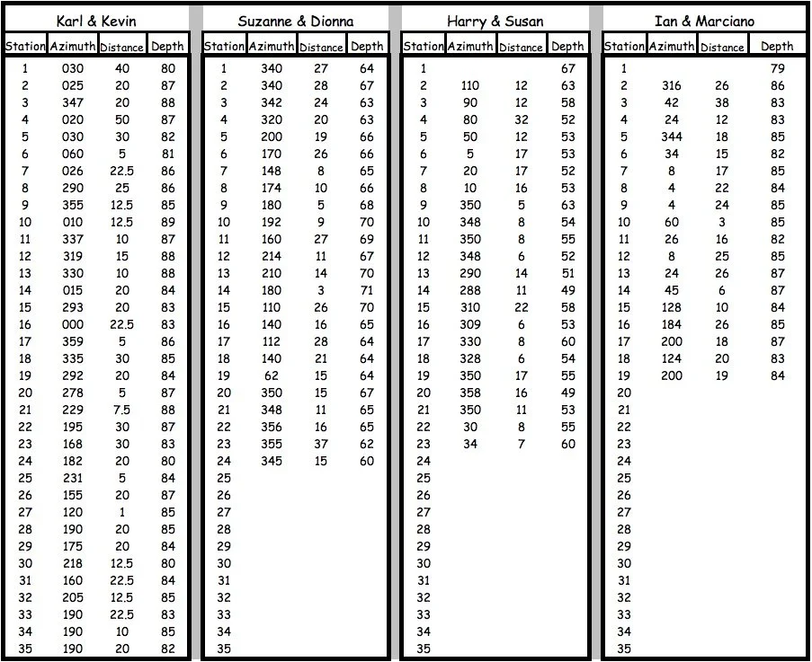 Based on the shape and depth of the pinnacle, 60’ and 80’ contours were selected to be the target of the line surveys. The survey teams were as follows: