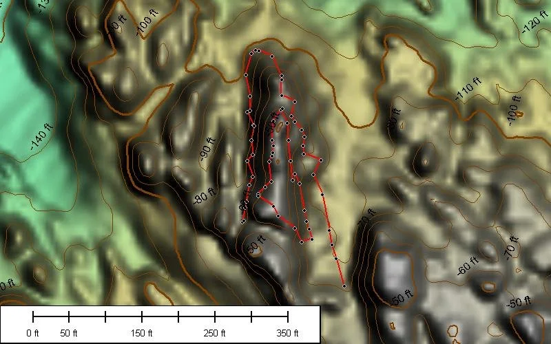 Set 2 survey contour lines, at 60 and 80ft depths. (The 60ft line circumnavigated the pinnacle)